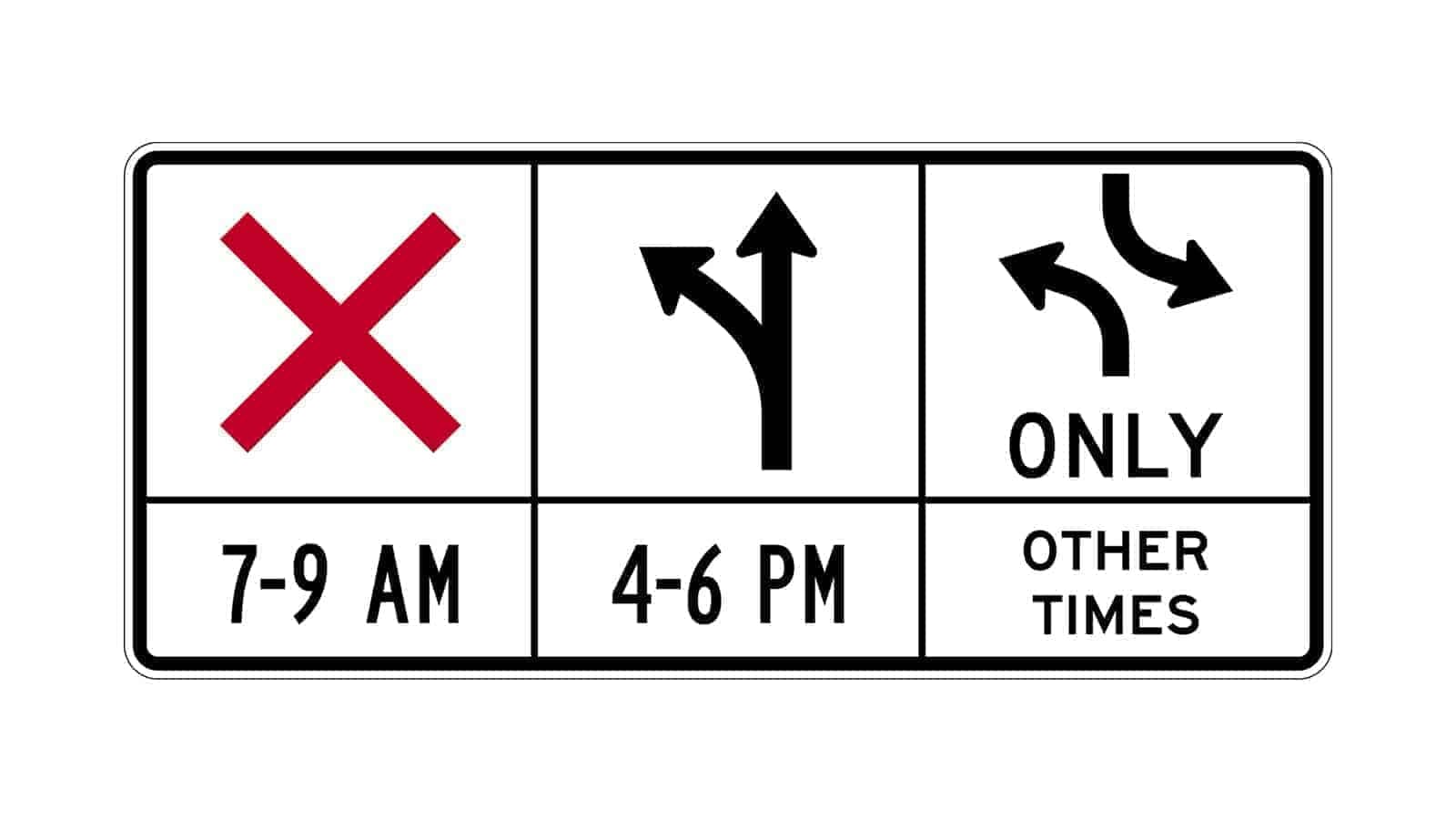 Reversible Lane Control Sign. This regulatory sign indicates a reversible lane and specifies at what time the lane is open for traffic. Reversible lanes may be open in one direction during the morning commute, and another direction in the afternoon.