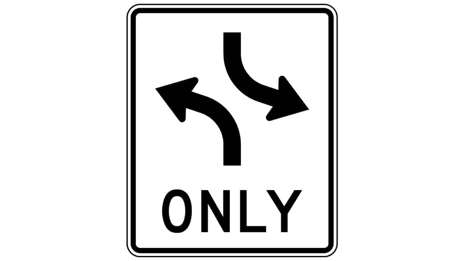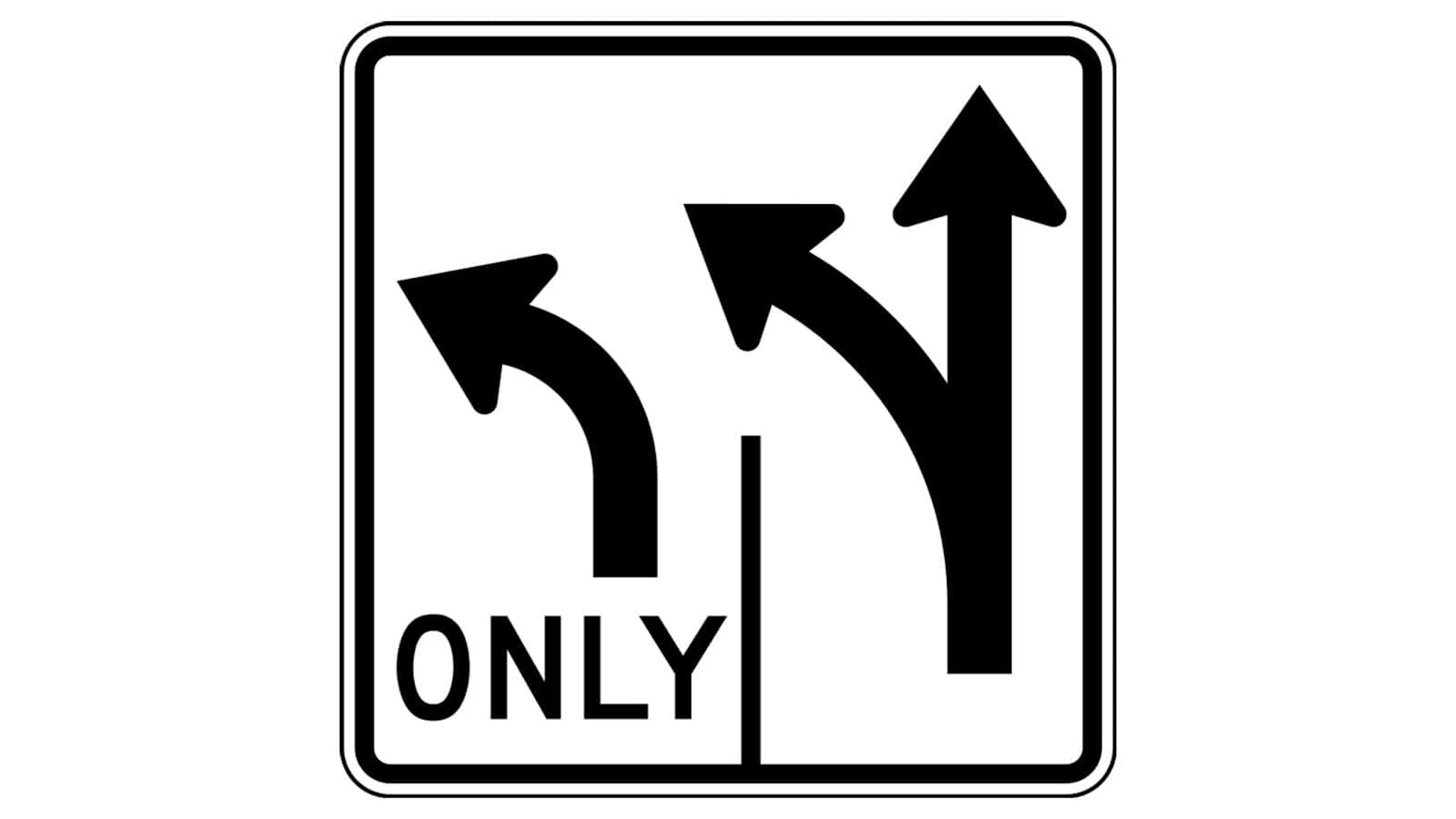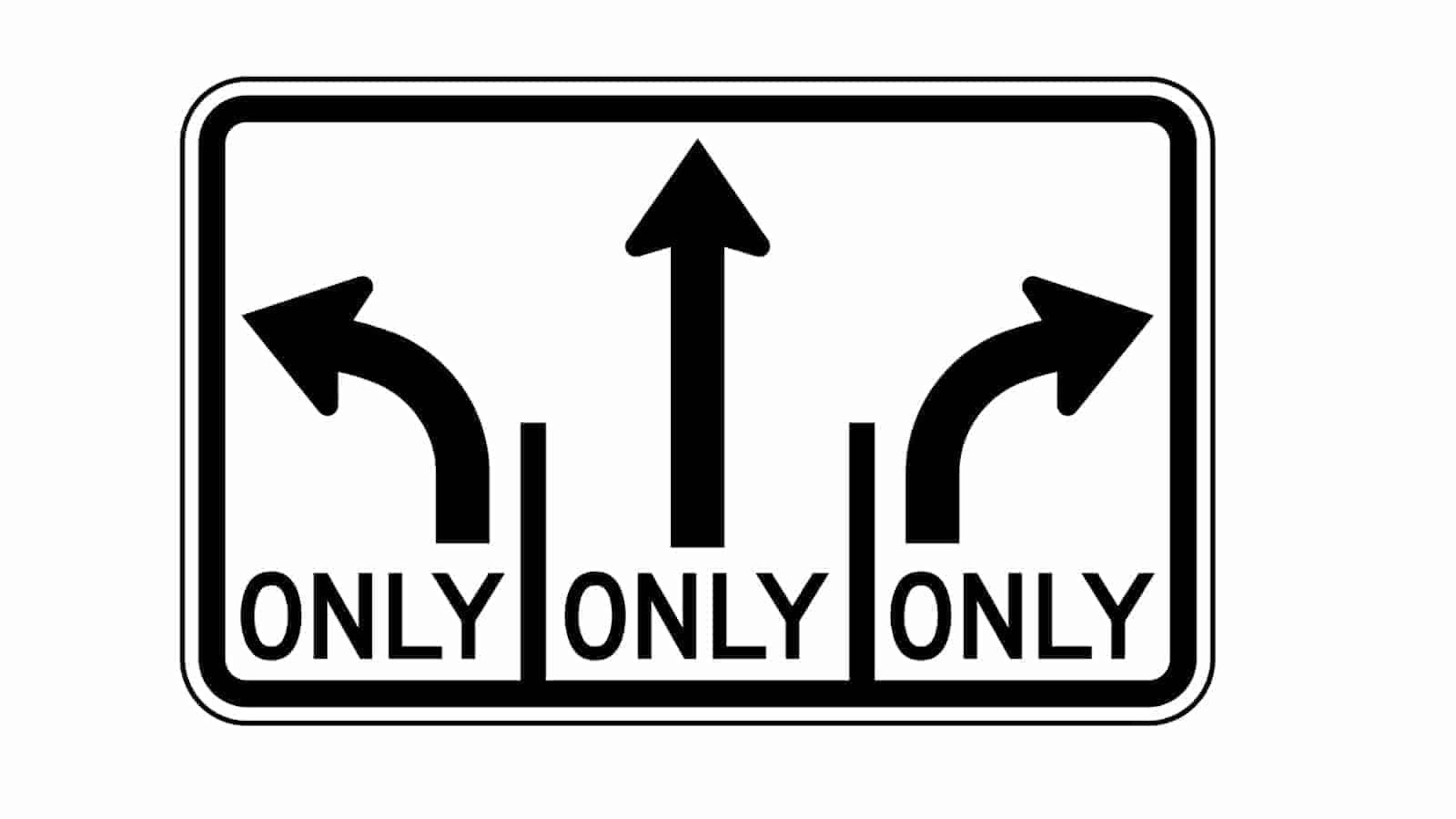 Turn Only Lanes Sign. This sign indicates that traffic may only move in the directions indicated for each lane. In this case, the left lane may only turn left, the middle lane may only go straight ahead, and the right lane may only turn right.