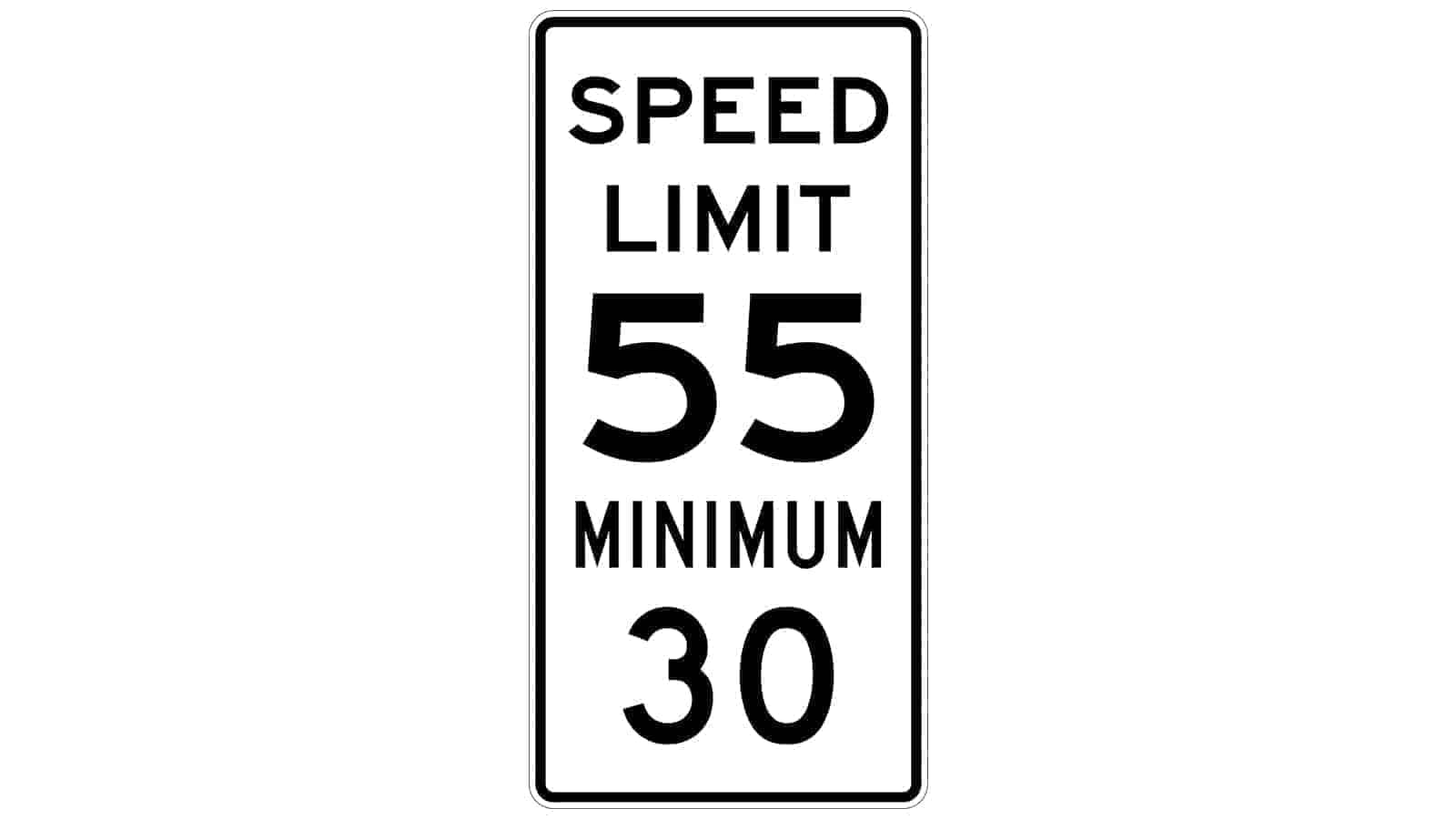 Speed Sign With Minimum Speed Limit Sign. This sign indicates a maximum AND minimum speed that you may travel. In this case, you must travel between 30-55 mph.