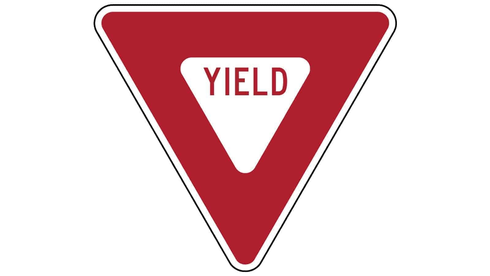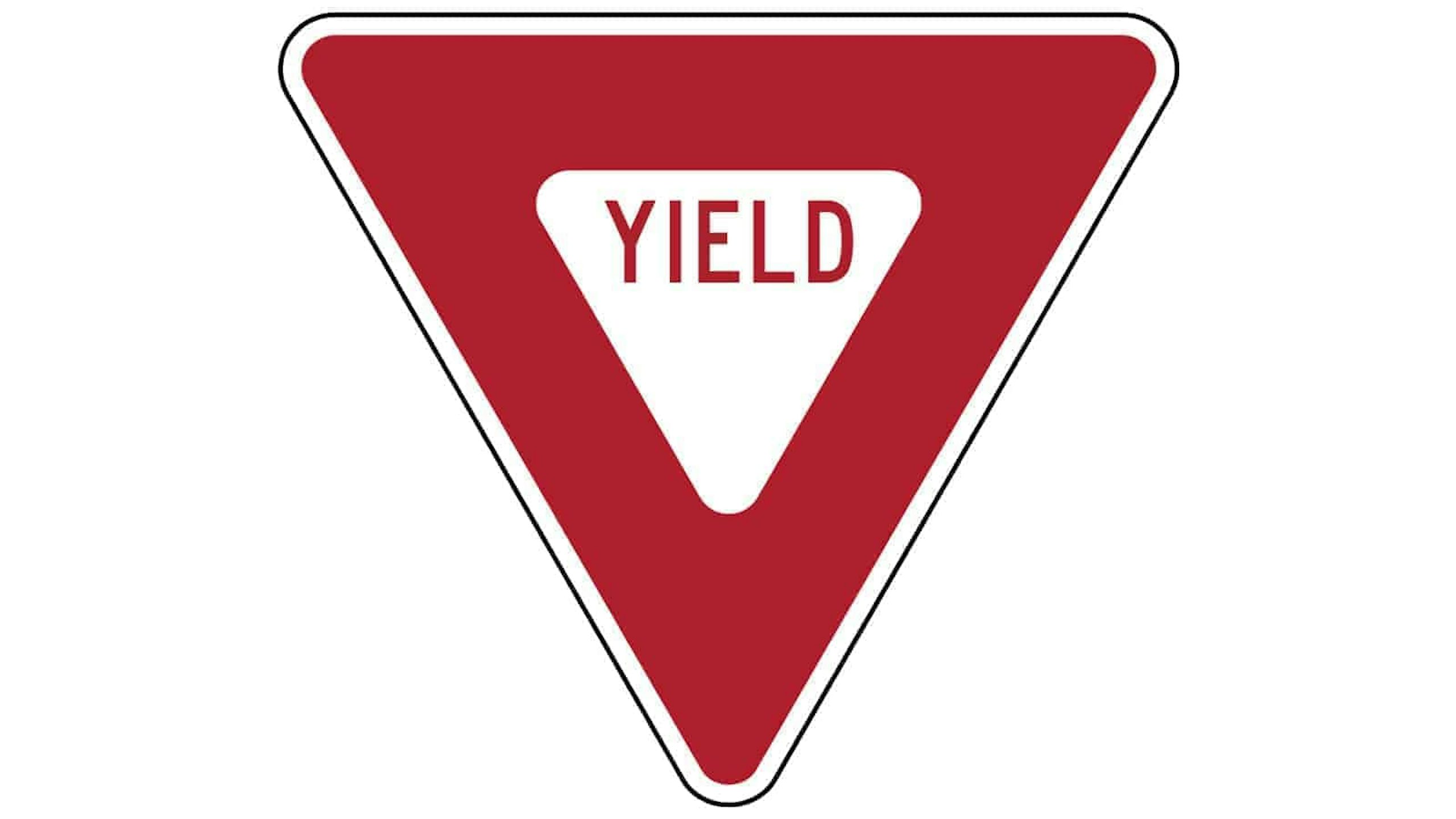 Yield Sign. Indicates you must slow down on approach and yield to all other traffic. You don’t have to stop if you are alone on the road.
