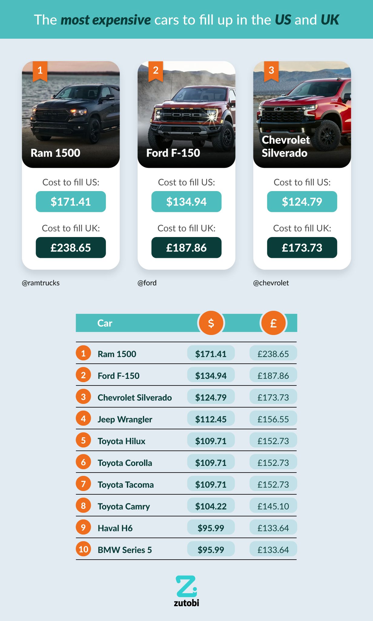 The most expensive car to fill up in both the US and the UK is the Ram 1500. The full-size pickup is currently in its fifth generation since its debut on the market over 40 years ago. Thanks to its enormous 33-gallon fuel tank, the Ram 1500 is the most expensive car to fill up, setting drivers back £238.65 in the UK, or $171.41 in the US.