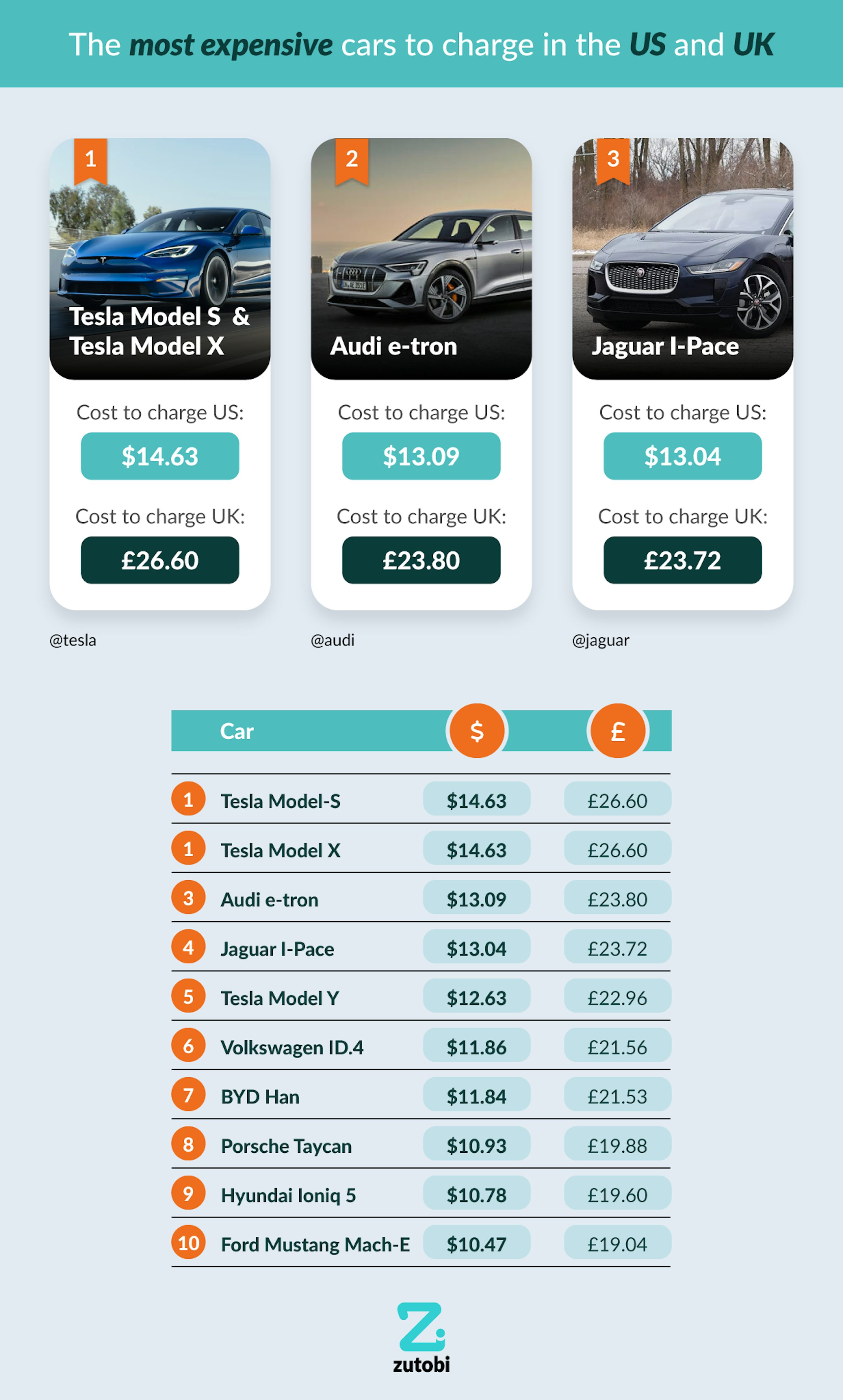 Two Tesla models share the top spot as the most expensive electric car to fully charge, as they share the same battery capacity. Both models cost $14.63 to fully charge in the US and £26.60 in the UK.