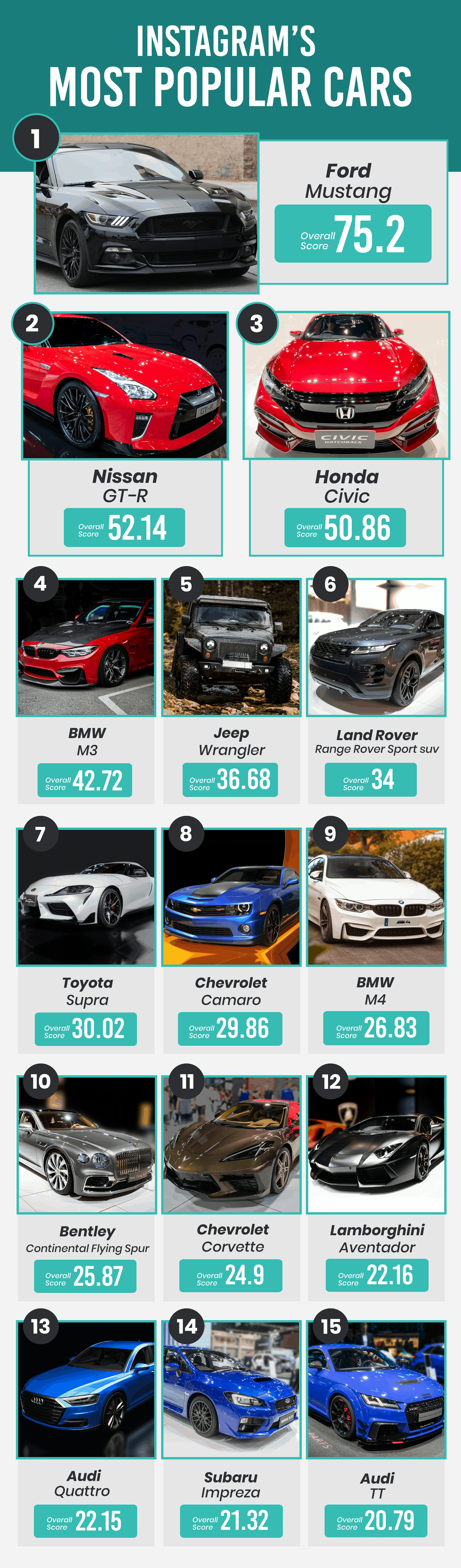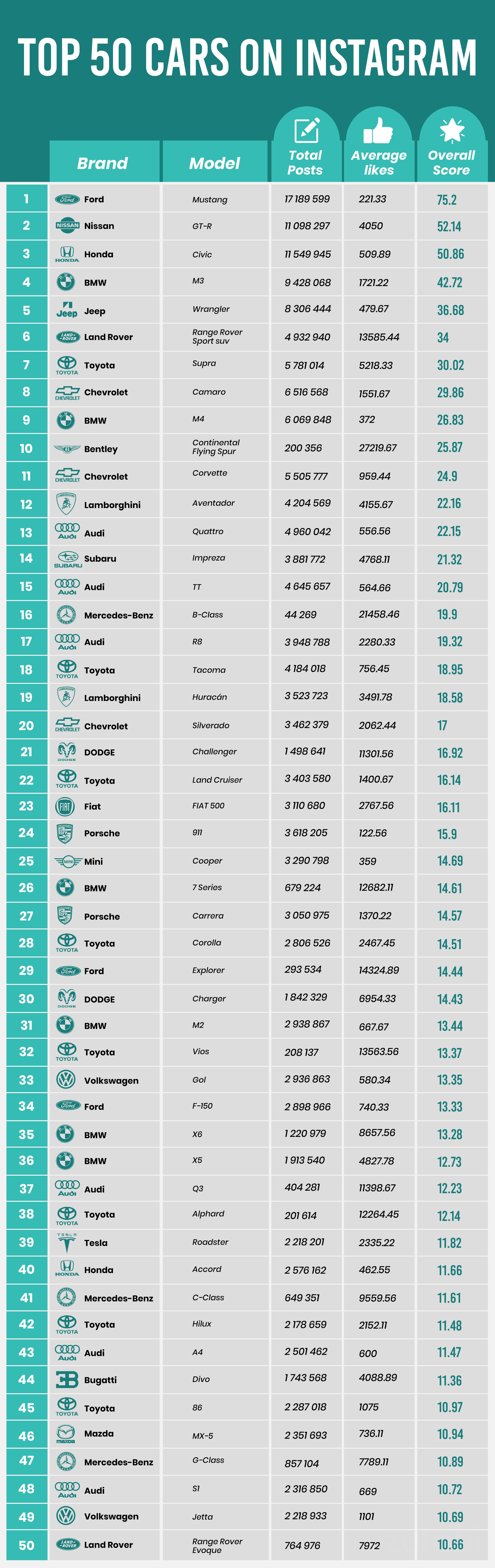 For each car, we looked at the total amount of posts for the two most popular hashtags, as well as the average amount of likes. We then came up with a normalized score to determine a fair placement in the list. General/broad hashtags have been excluded.