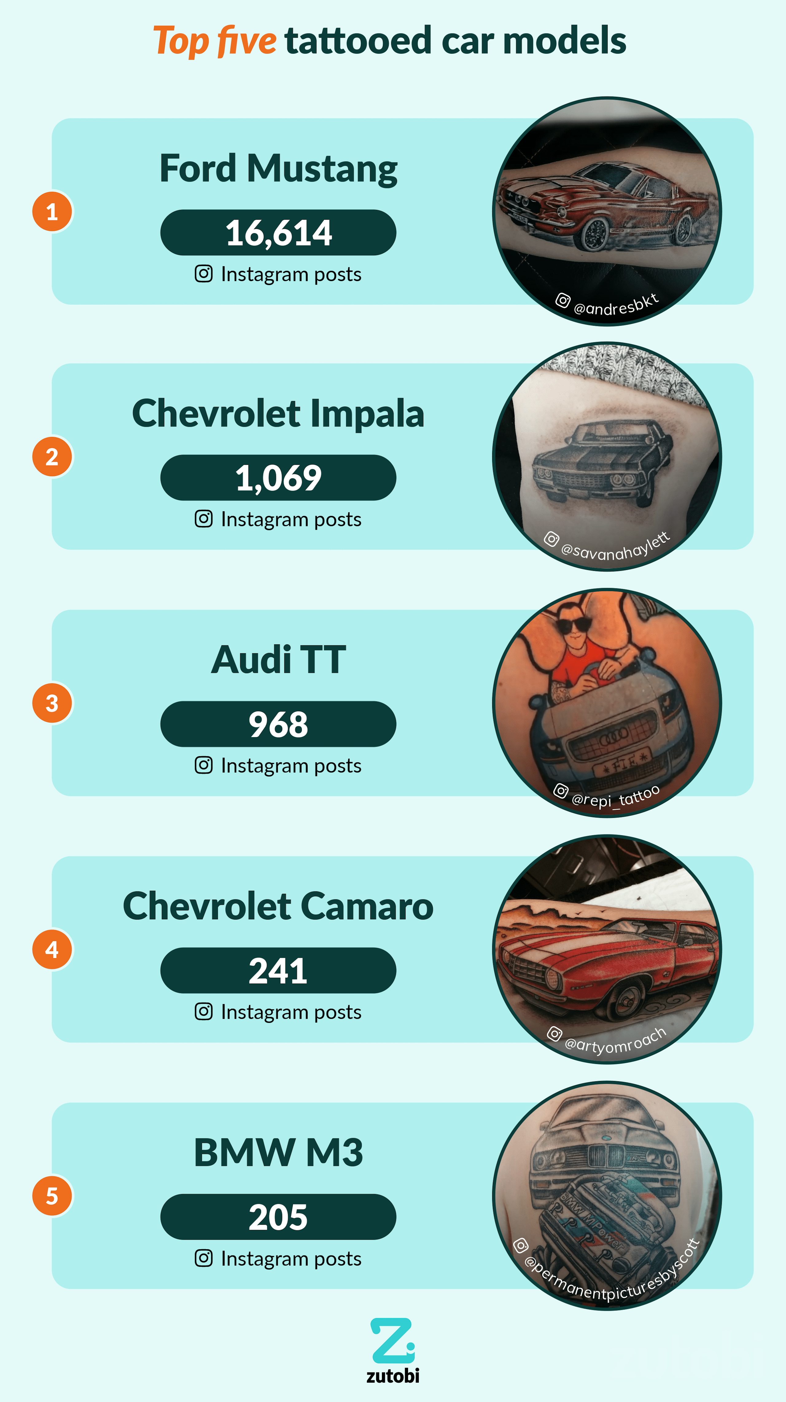 The only other car to have over 1,000 Instagram posts dedicated to tattoos is the Chevrolet Impala, this shows that these two are by far the most inked car models. Despite being far less famous than the Mustang, the Impala is another icon of the American motor industry.