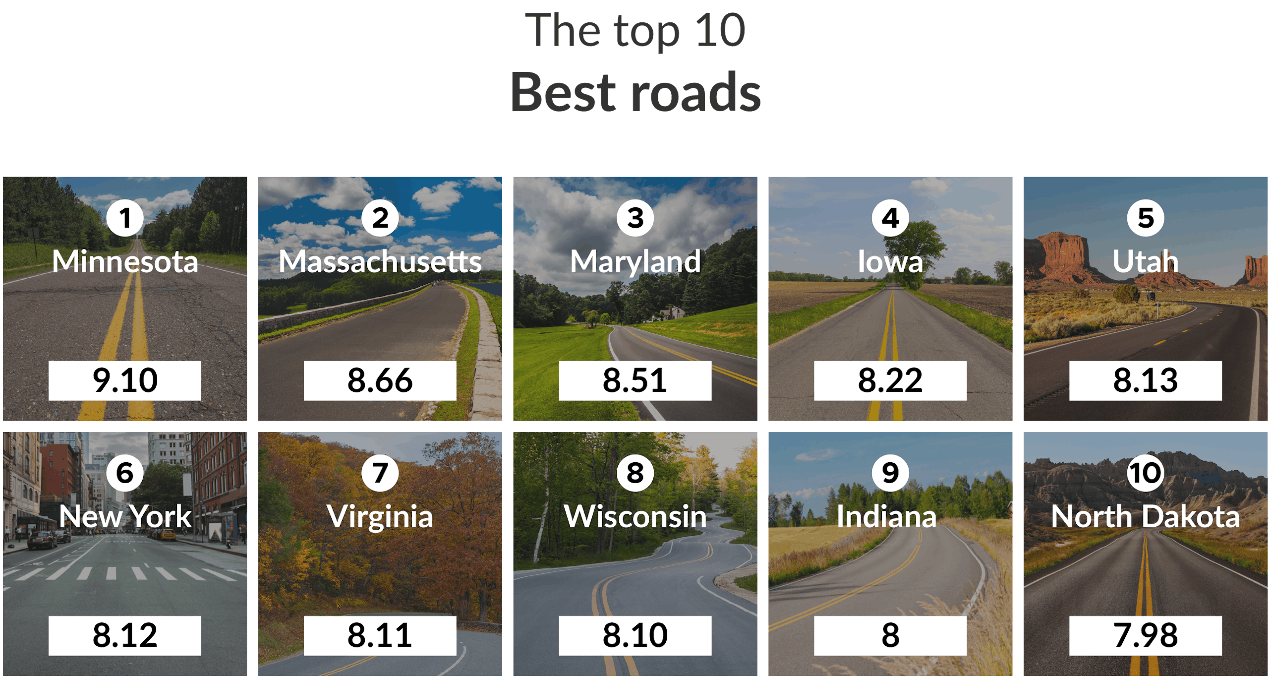 Filling the final spot in our top 10 is North Dakota. It may be the only entry to receive a score below 8, but with 93.4% of its roads rated acceptable or better, it more than deserves its place.