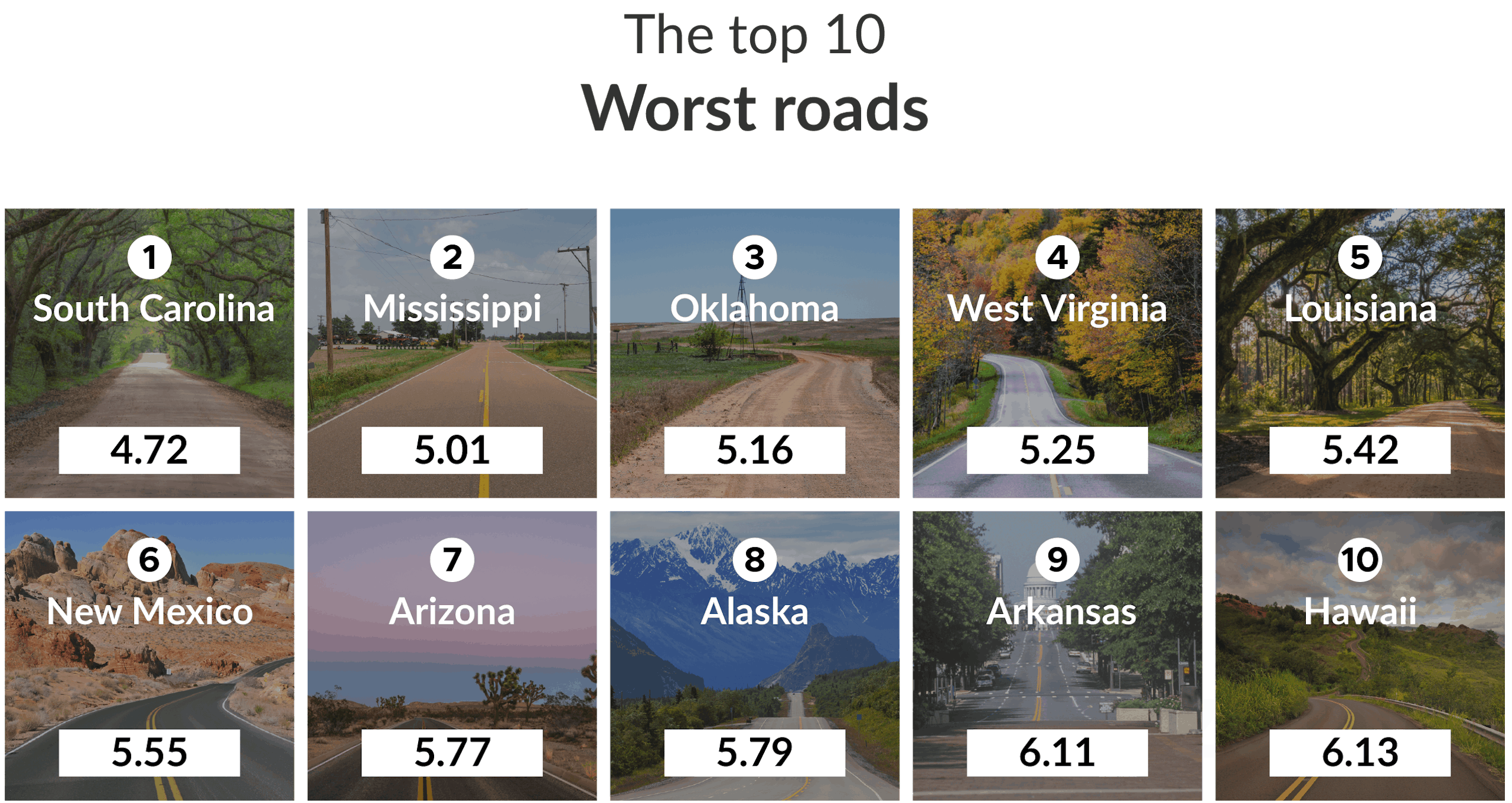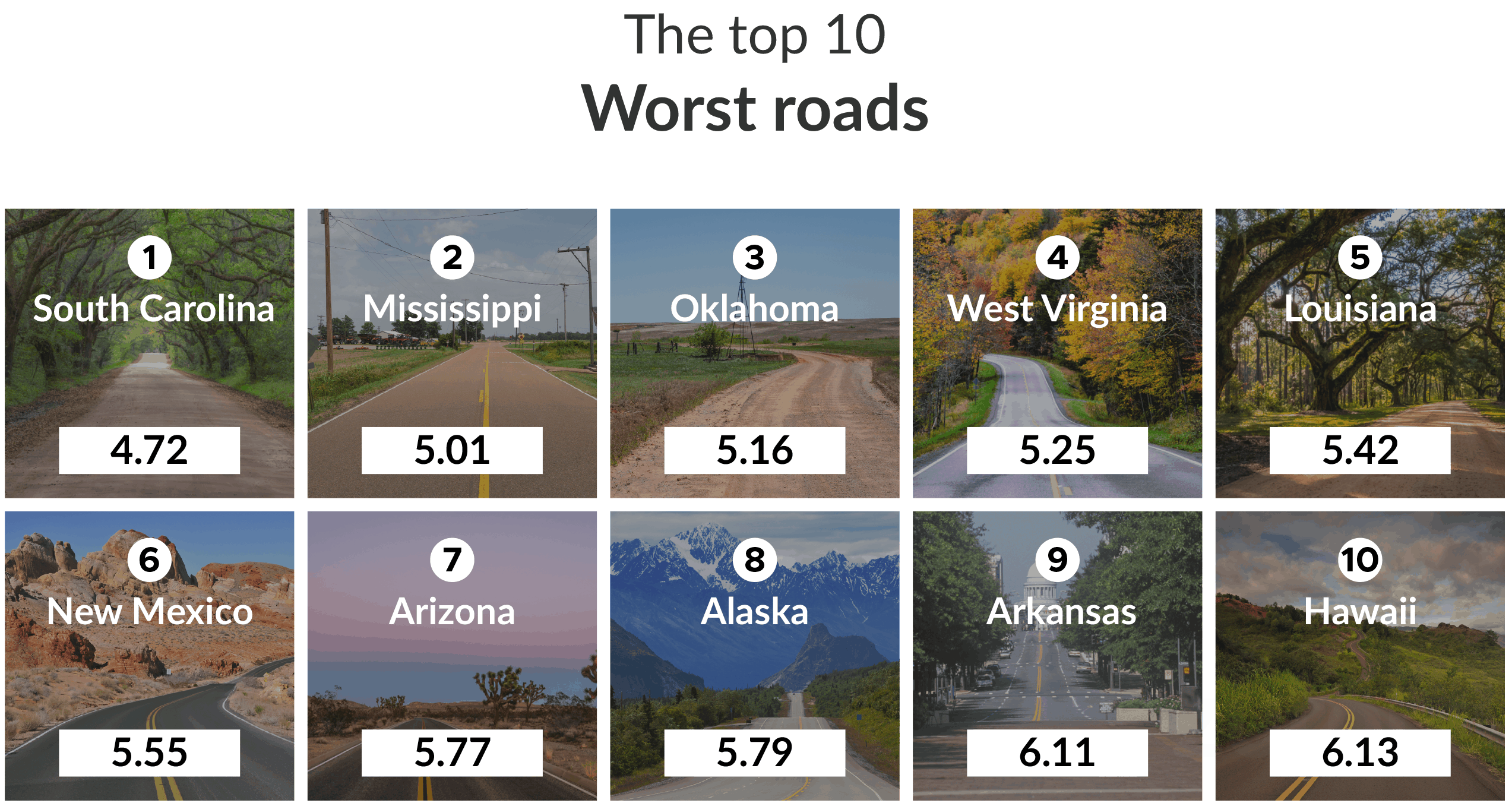 Coming in at the very bottom with the worst roads in the country is South Carolina. It’s the only state to be scored below 50% on just 4.72, and it has the highest highway fatality rate of 1.83.