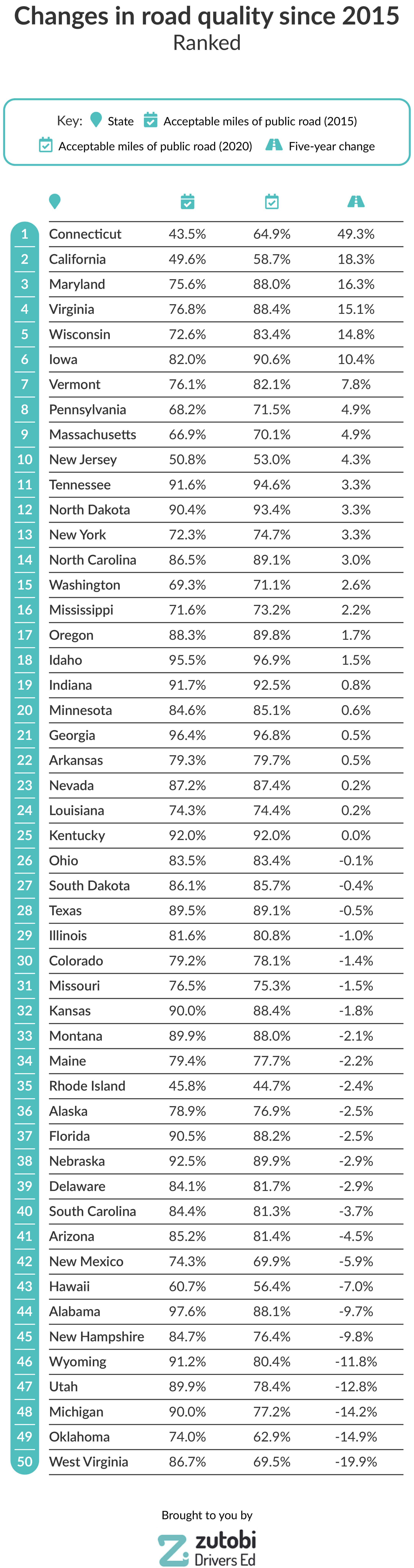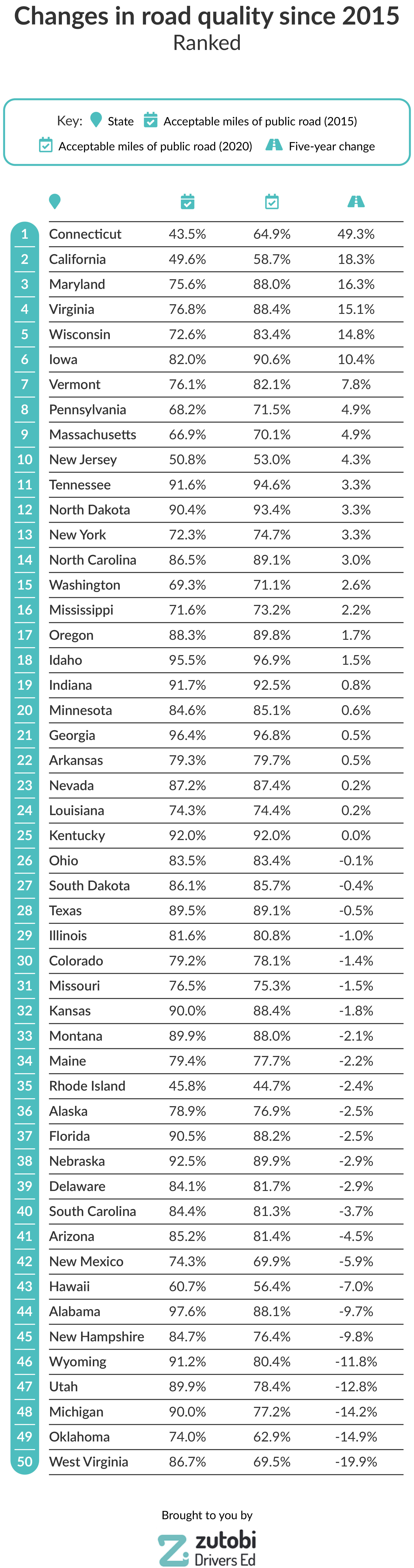 Connecticut has experienced by far the biggest increase in road surface quality since 2015, with a 49.3% increase in the proportion of its roads rated acceptable or higher. The next most-improved is California with an increase of 18.3%.