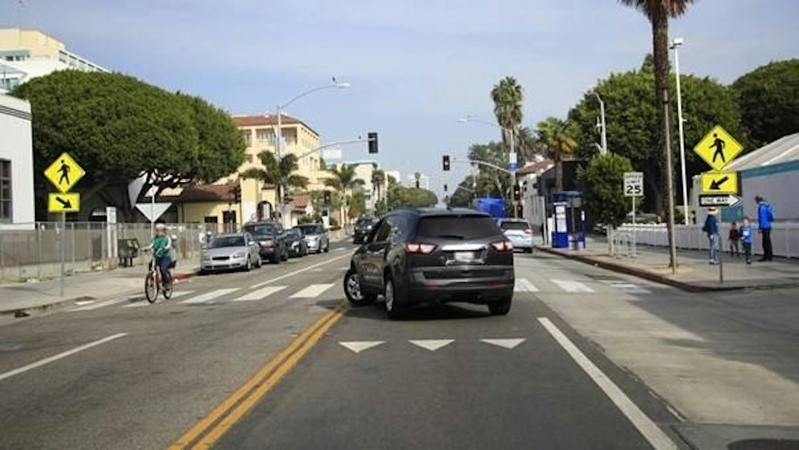 Sharing the road means turning while paying attention to cyclists and pedestrians crossing.