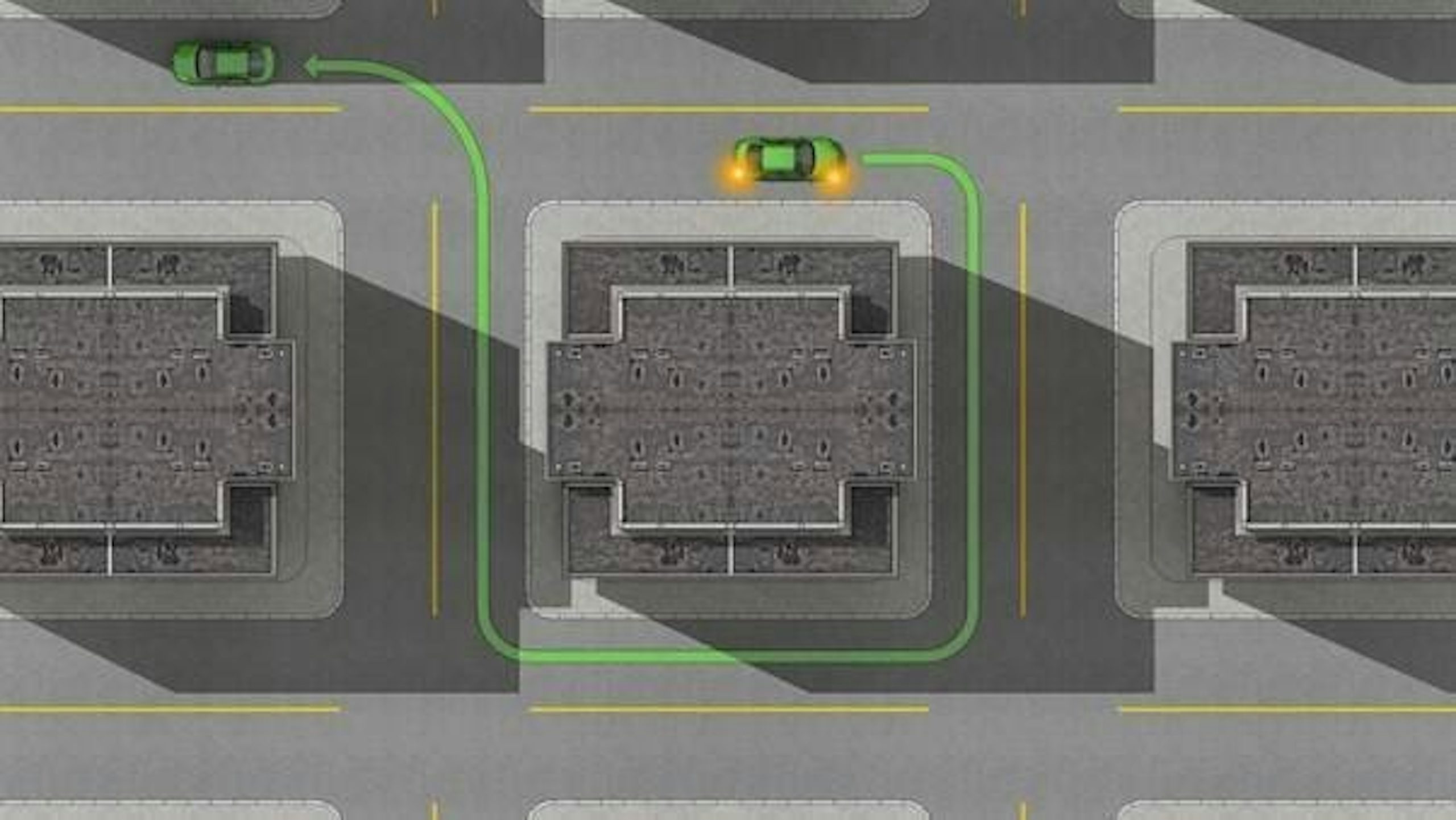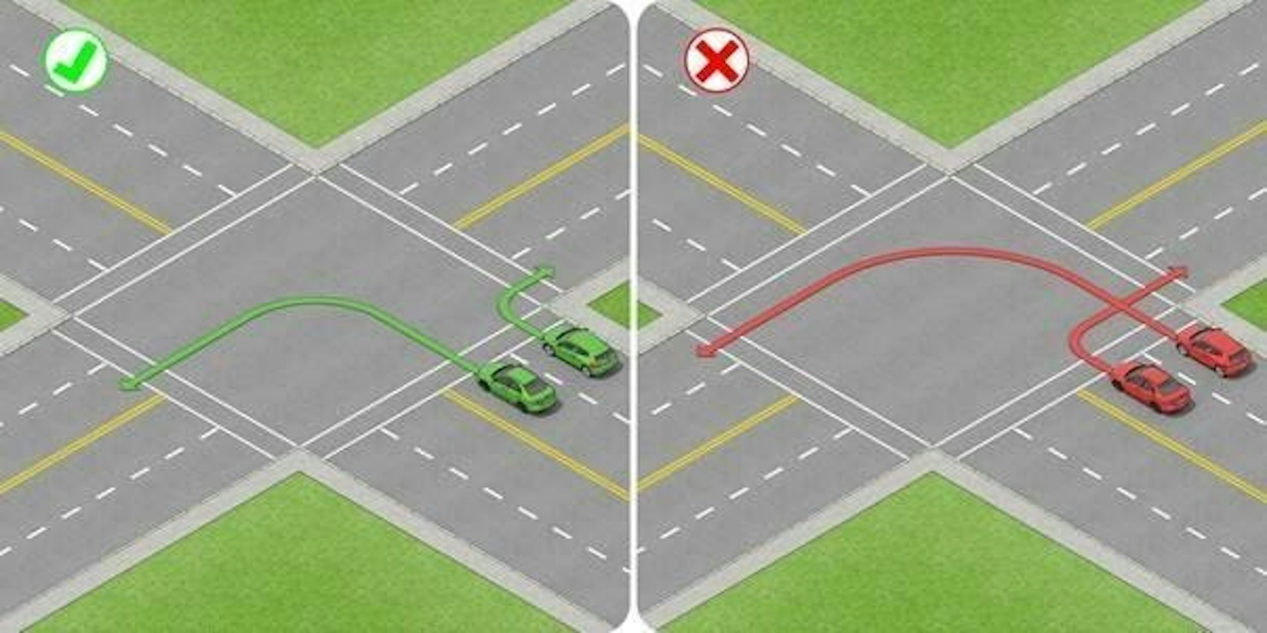In the following example, the red cars aren’t correctly positioned for their respective turns and risk colliding with each other. The green cars are turning from the correct lane.